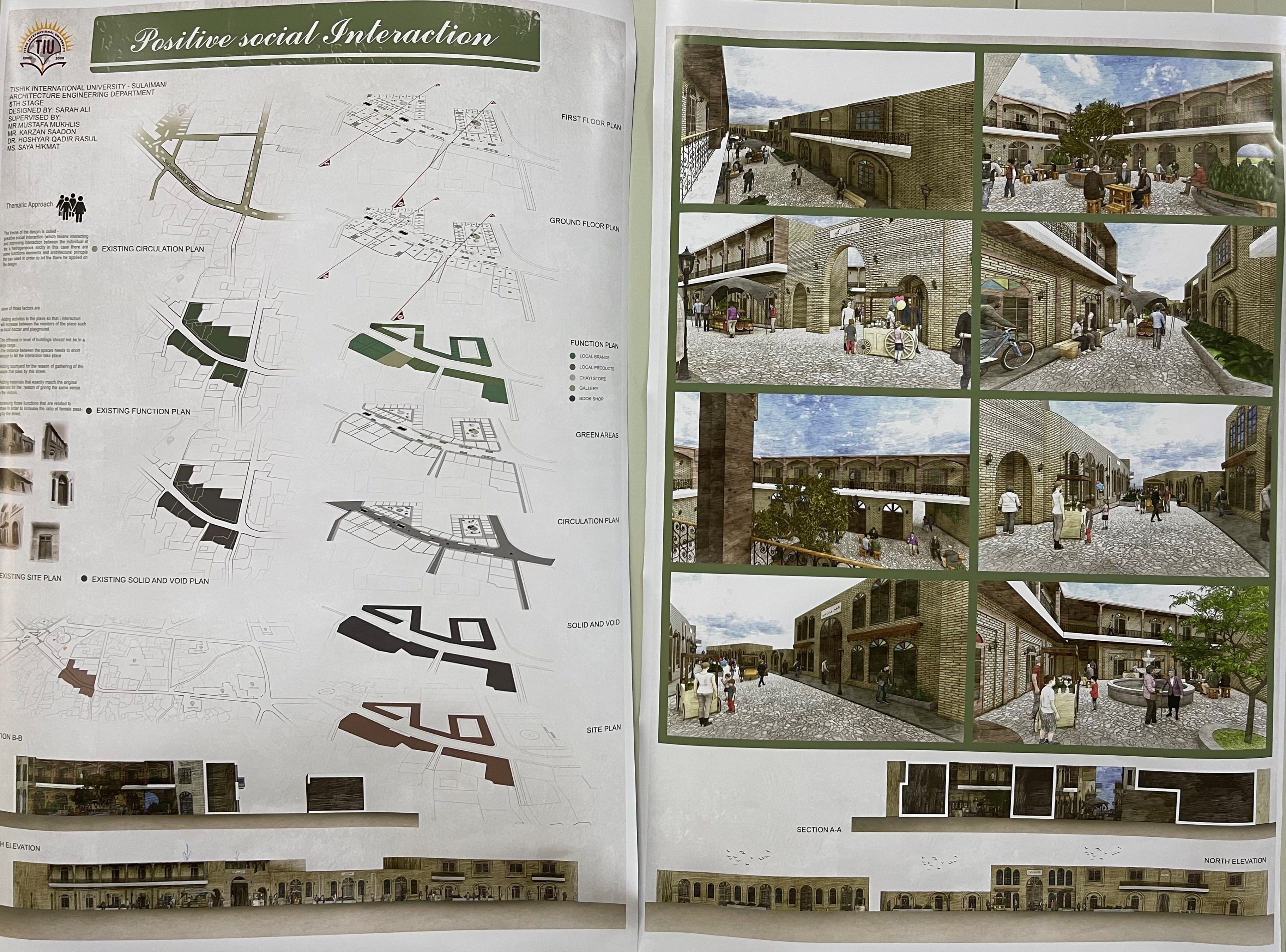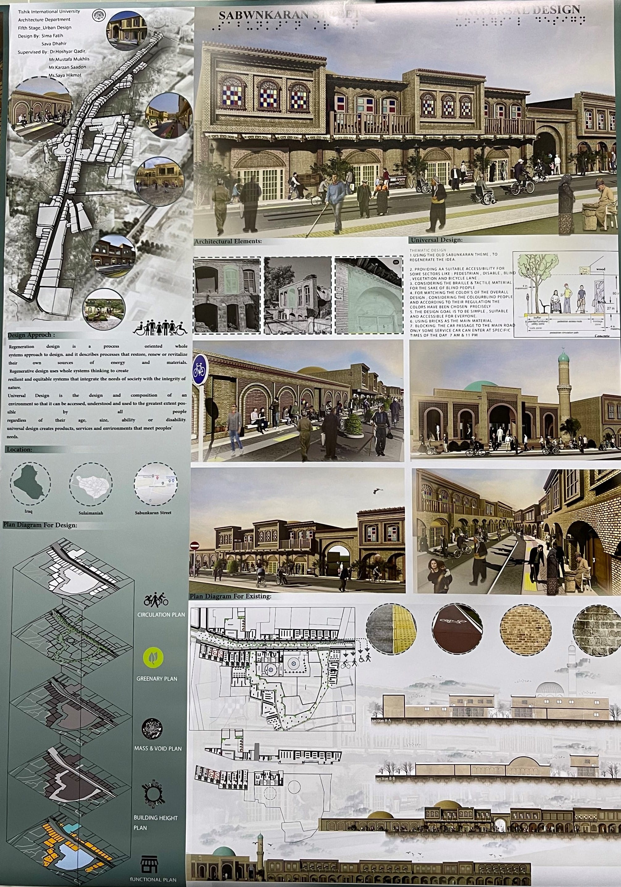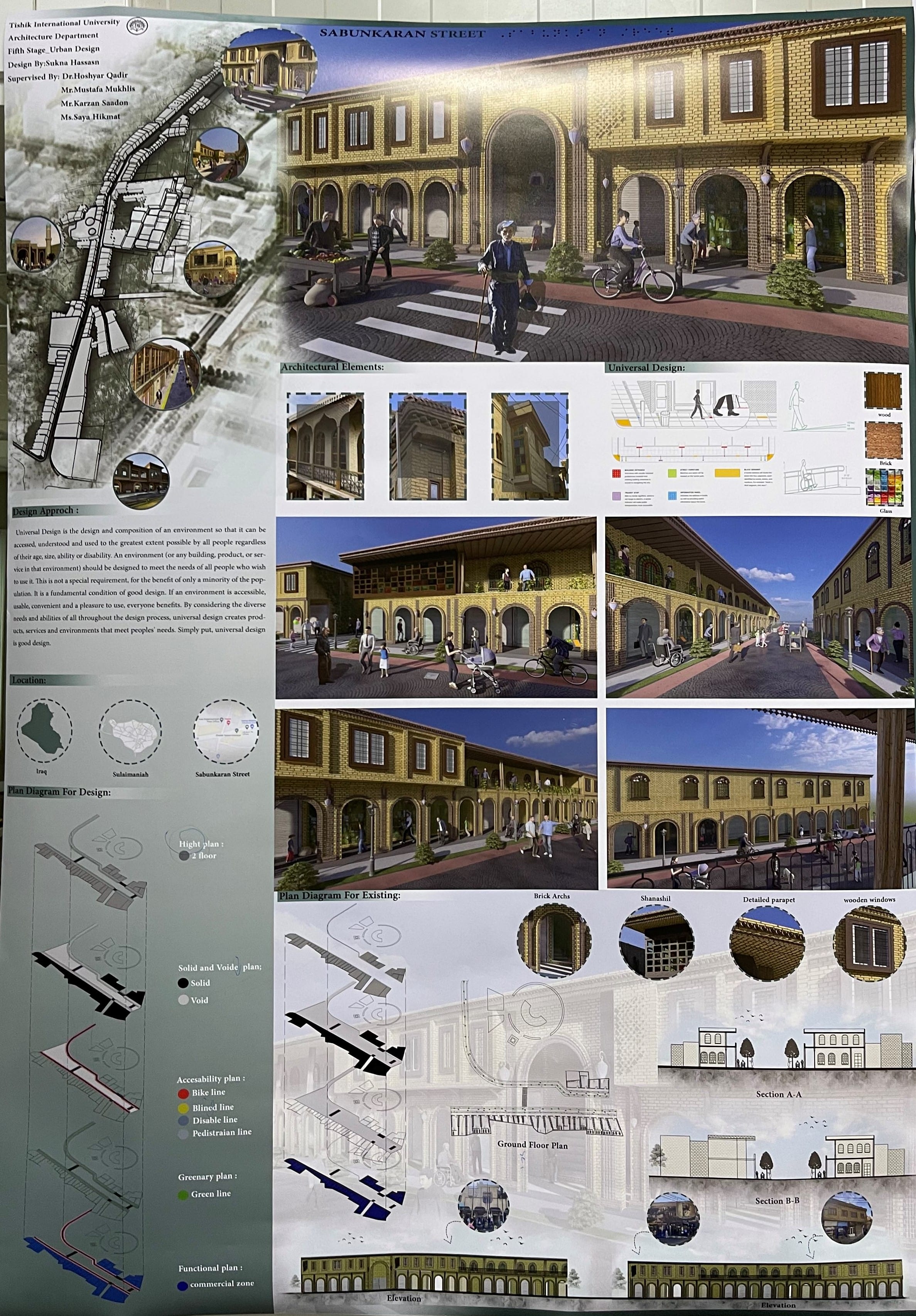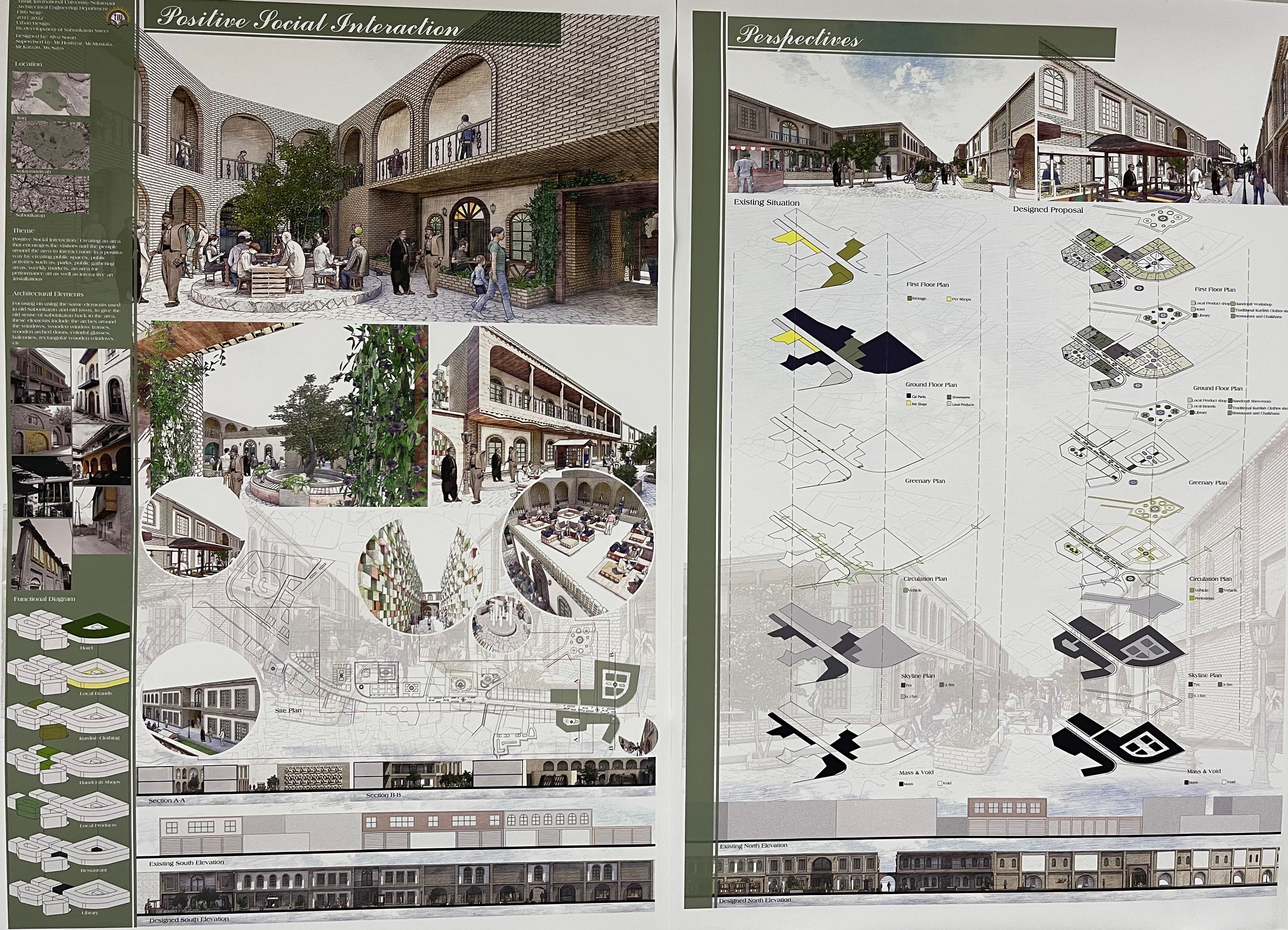 The project location was in one of the historical zones in the city center of Sulaimanyah, which was ‘Sabunkaran Street’. The street has so many values and problems at the same time because of the significant changes in the population’s lifestyle nowadays compared to the previous for which the street was initially designed. One of the main problems is car and vehicle circulation because it was designed for pedestrian circulation originally. This has generated crowdedness, traffic jams and difficulty walking through the street. Another problem is the change in the function of the area, that previously it was a residential complex but now its commercial zone.