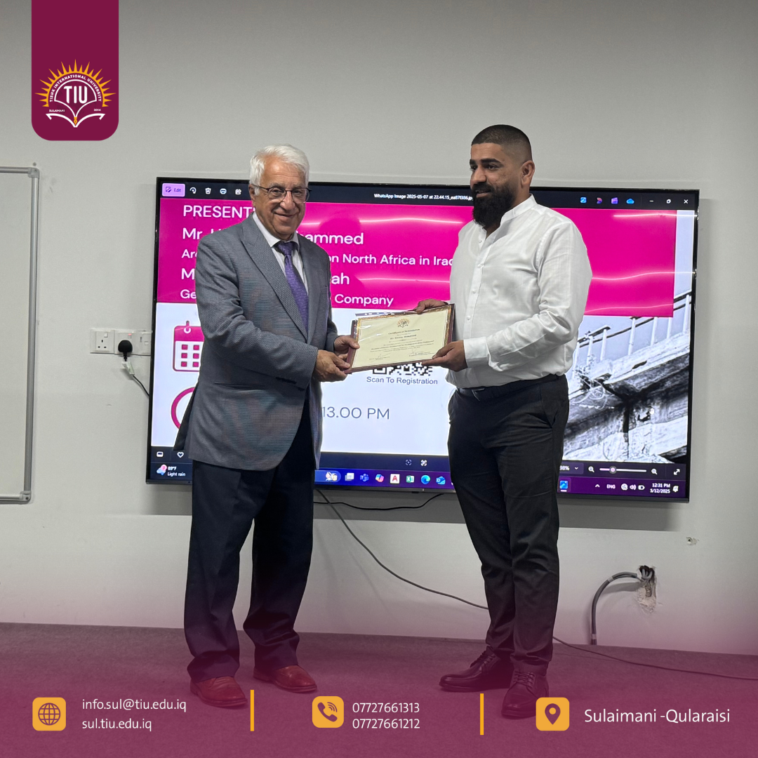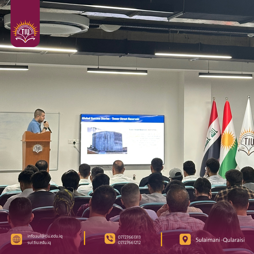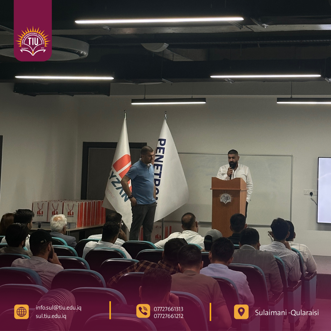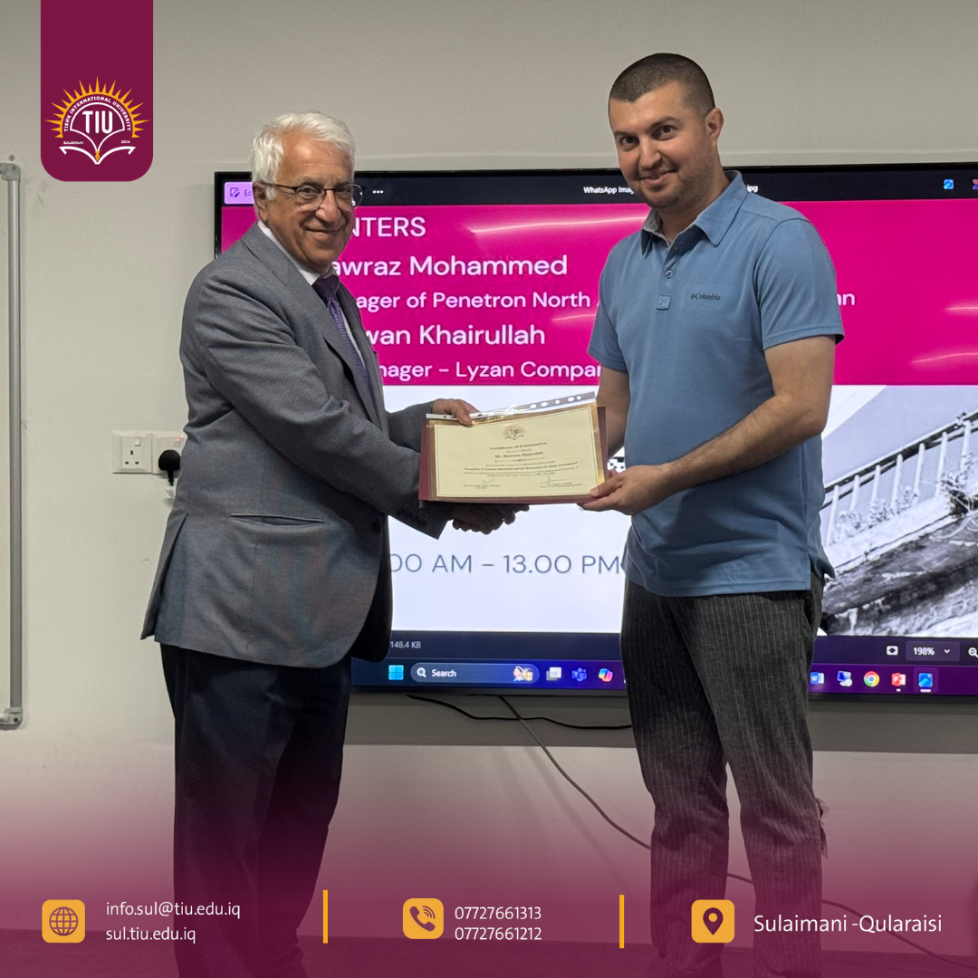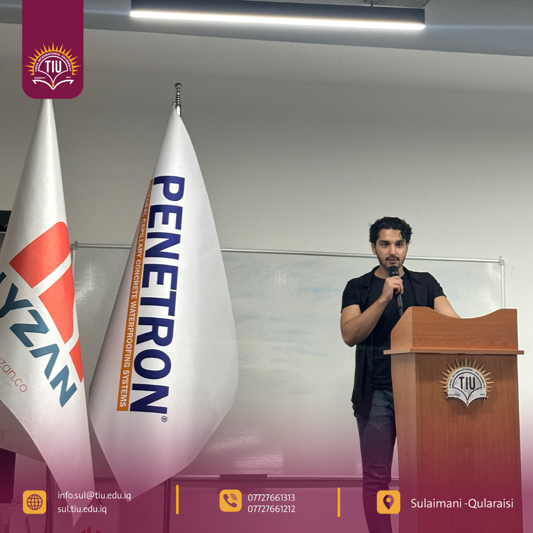 The event was enriched by the expertise of two distinguished speakers. Mr. Hawraz Mohammed, Area Manager for Penetron North Africa and a specialist in concrete durability, delivered a comprehensive lecture on innovative waterproofing and admixture technologies. He provided a global perspective on best practices in concrete engineering. In addition, Engineer Sherwan Khairullah, the Owner and General Manager of Lyzan Company, shared valuable practical insights from local projects and industry experience. His presentation emphasized the importance of adopting modern standards in construction practices within the region. This successful collaboration between TIU and Lyzan Company exemplifies the university’s commitment to bridging academic research with industry needs.