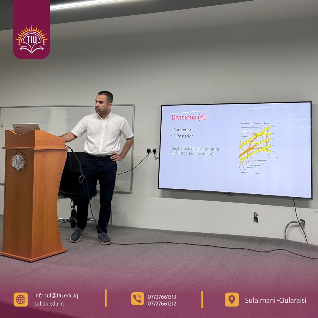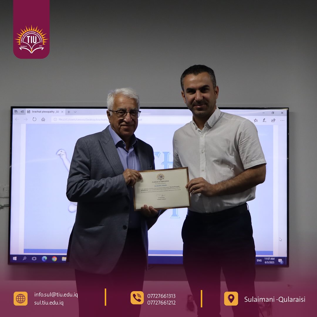 The Physiotherapy Department at Tishk International University – Sulaimani successfully organized an international workshop titled “Brachial Plexopathy Rehabilitation” on Tuesday, June 3rd, 2025. The event was held at the university’s Conference Hall and featured distinguished guest speakers, who shared their expertise on the rehabilitation of brachial plexus injuries.