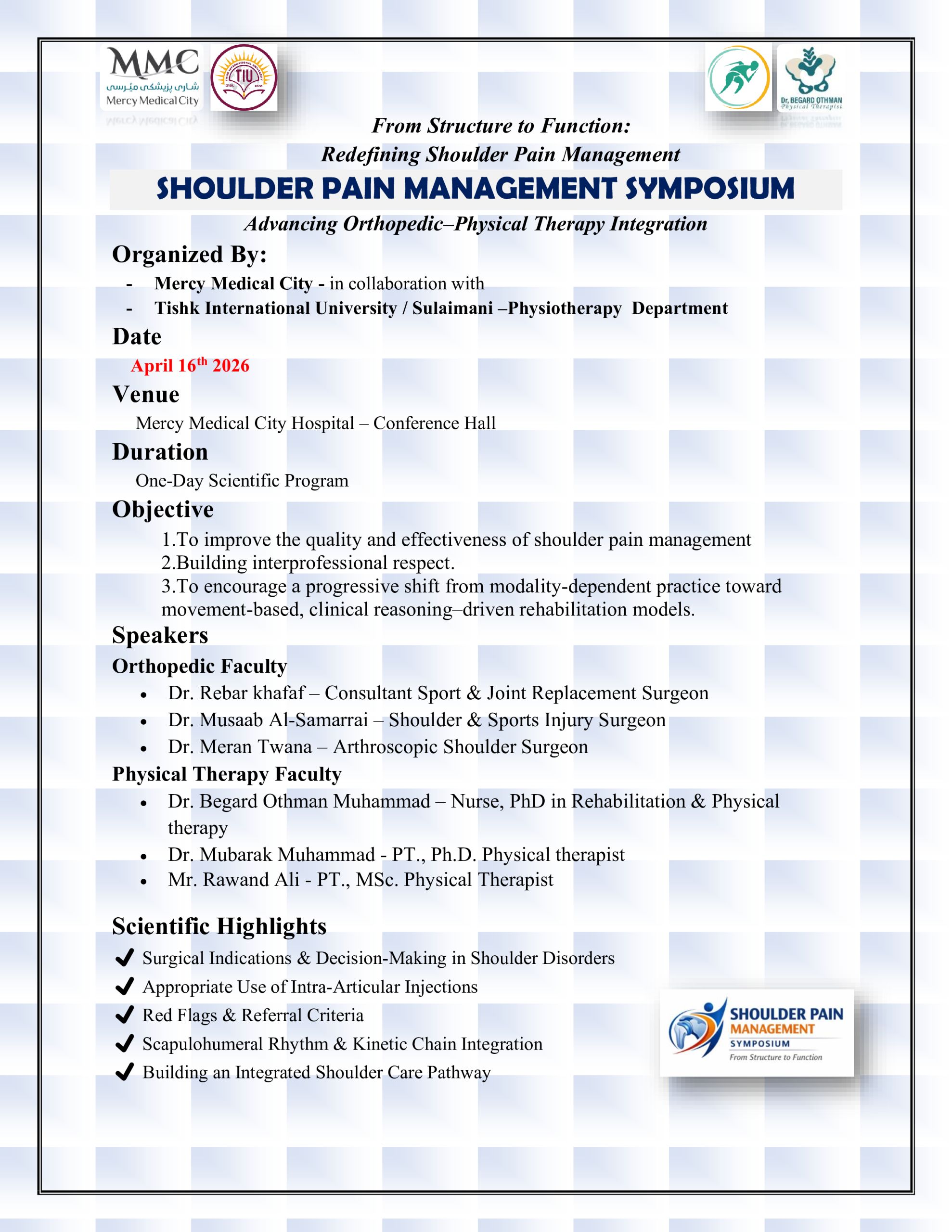 Kewan Hama2026-03-23T23:49:11+03:00TIUS and Mercy Medical City Announce Major Shoulder Pain Symposium In a significant step toward advancing healthcare standards, Mercy Medical City, in collaboration with the Physiotherapy Department of Tishk International University - Sulaimani (TIUS), has announced a specialized scientific symposium titled: “From Structure to Function: Redefining Shoulder Pain Management” The event is scheduled to take place on April 16, 2026, at the Mercy Medical City Hospital Conference Hall. This one-day scientific program aims to bring together experts in orthopedic surgery and physical therapy to explore modern approaches to shoulder pain treatment. The symposium is designed to bridge the gap between [...]