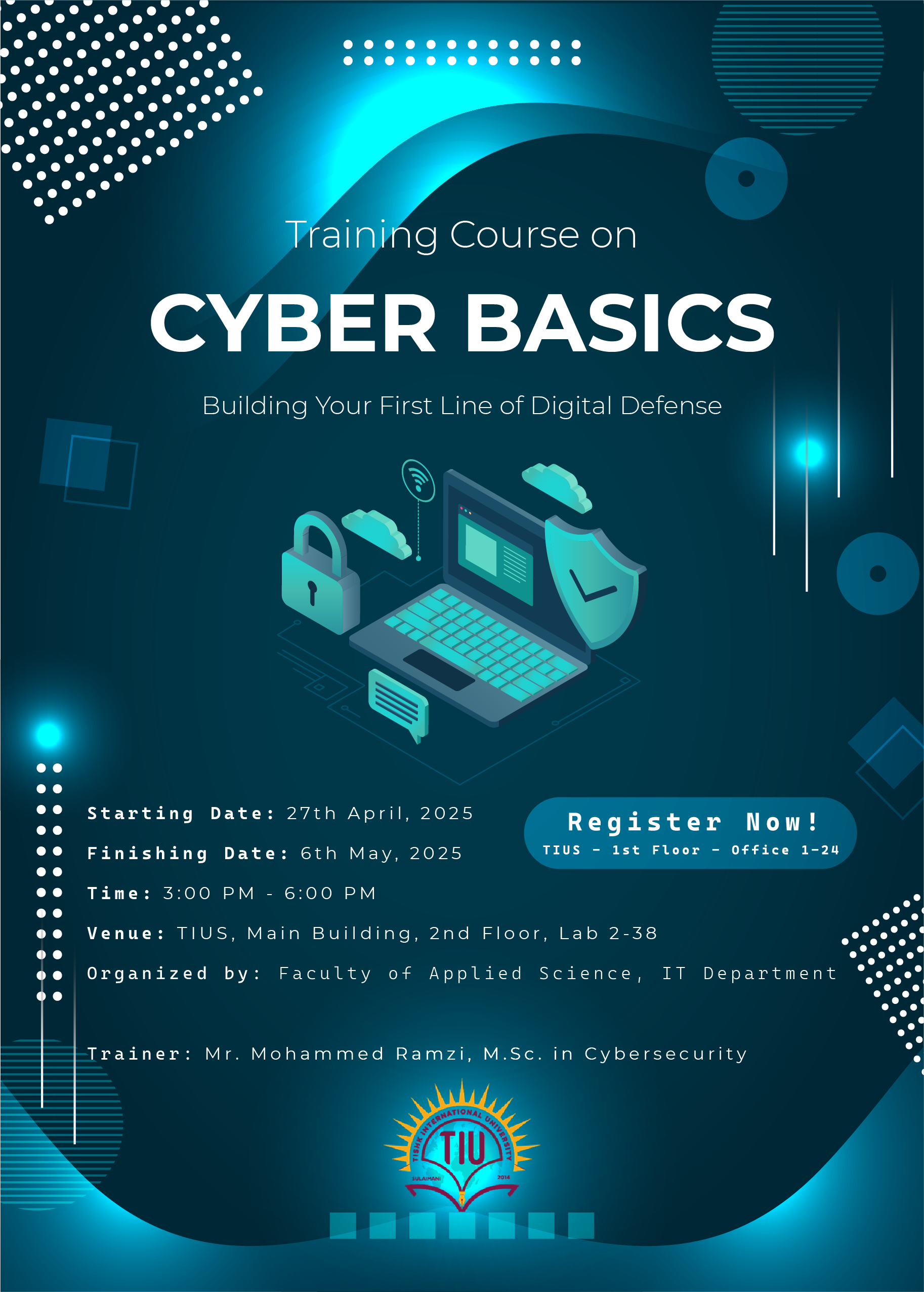 KewanHama2025-08-31T06:48:53+00:00The Faculty of Applied Science—Information Technology Department at Tishk International University is excited to announce a 9-day, hands-on training course aimed at introducing students and staff to the core principles of cybersecurity. This workshop, titled "Cyber Basics: Building Your First Line of Digital Defense," is a practical and accessible path to understanding and defending against modern cyber threats for anyone looking to sharpen their digital safety skills. Course Highlights Led by Mr. Mohammed Ramzi, M.Sc. in Cybersecurity, participants will explore essential cybersecurity concepts through real-world examples and interactive labs. The training will cover crucial topics, including: Recognizing and responding to [...]